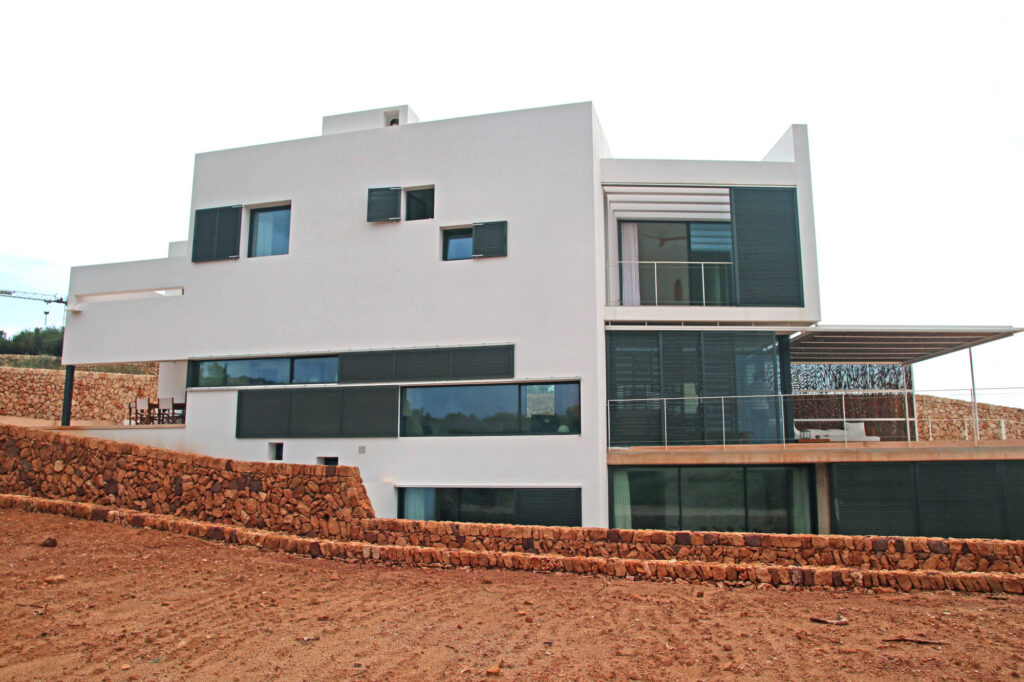 Las vistas exteriores de la casa permiten apreciar el conjunto arquitectónico y cómo la carpintería se integra en la fachada, reforzando el carácter moderno y mediterráneo del proyecto.