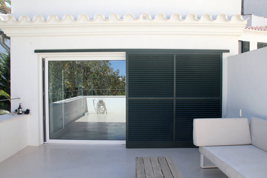 La fachada exterior se complementa con persianas de aluminio con sistema «galfons» o marco empotrado, que se integran en la pared para un acabado limpio y minimalista.